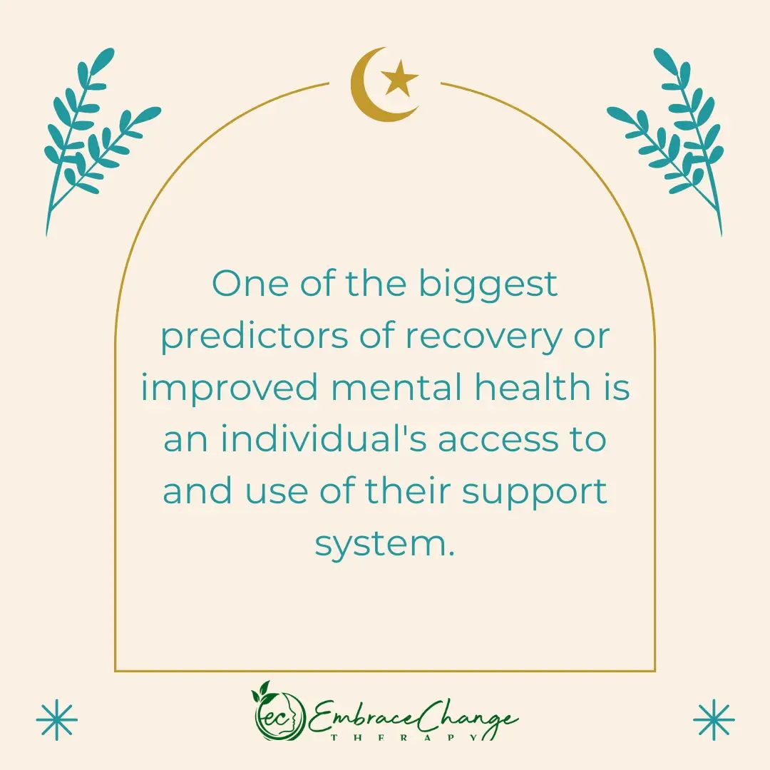 One of the biggest predictors of recovery or improved mental health is an individual’s access to and use of their support system. Support systems can consist of family, friends, mentors, or peer relationships. It can include teachers, classmates, a faith community, or co-workers and can look different for different people. Some people may have a large support system and others may have a smaller or more intimate support system. Some individuals have access to healthy family relationships, and others may have a chosen family.